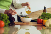 Nieznane ludzkie dłonie gotują w kuchni. Kobieta krojąca zieloną cebulę. Zdrowy posiłek i koncepcja wegetariańskiej żywności