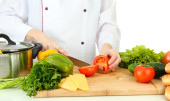 kobieta ręce cięcia warzyw, na białym tle