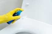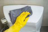 Zdjęcie "Gospodyni sprzątająca brudny kran ze stali nierdzewnej na umywalce w toalecie. Roztwór do czyszczenia cieczy w natrysku pokojówki na brudnym kranie w toalecie i za pomocą chusteczki z mikrotkaniny na karcie wody." może być wykorzystywane do celów osobistych i komercyjnych zgodnie z warunkami zakupionej licencji Royalty-free. Obraz jest dostępny do pobrania w jakości wysokiej rozdzielczości do 5760x3840.