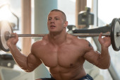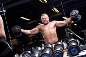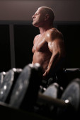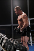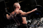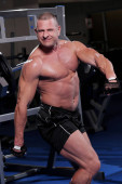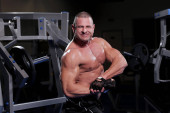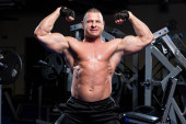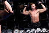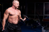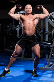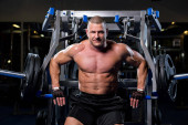 Przystojny muskularny mężczyzna ćwiczy i pozuje na siłowni