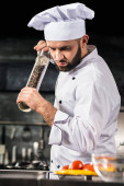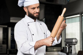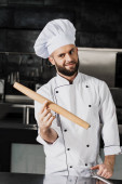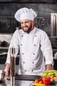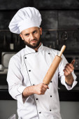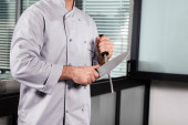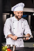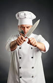 Profesjonalny kucharz w restauracji. Portret kucharza ze skrzyżowanymi nożami.