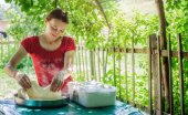 Kobieta przygotowuje jedzenie i ucztę na letni obiad w wiejskim domku rustykalnym zewnątrz kuchnia.