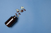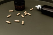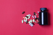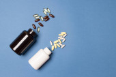 biały pojemnik witaminy i pigułki na czarnym tle papieru.