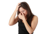 Młoda piękna kobieta z zatok ciśnienia, dotykając jej nos.