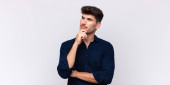 Zdjęcie "poziomy obraz troskliwego mężczyzny dotykającego podbródka, odwracając wzrok odizolowanego na niebiesko" może być wykorzystywane do celów osobistych i komercyjnych zgodnie z warunkami zakupionej licencji Royalty-free. Obraz jest dostępny do pobrania w jakości wysokiej rozdzielczości do 5760x3840.