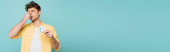 poziomy obraz troskliwego mężczyzny dotykającego podbródka, odwracając wzrok odizolowanego na niebiesko