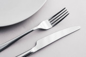 Pusty talerz i sztućce jako makieta zestaw na białym tle, górna zastawa stołowa do dekoracji stołu szefa kuchni i marki menu