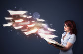 bardzo młoda kobieta, czytanie książki, podczas gdy kolorowe linie są comin