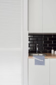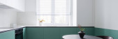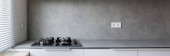 Zdjęcie "Panorama prostej kuchni z dużym oknem, szarym blatem i vintage stylu, drewniana szafka" może być wykorzystywane do celów osobistych i komercyjnych zgodnie z warunkami zakupionej licencji Royalty-free. Obraz jest dostępny do pobrania w jakości wysokiej rozdzielczości do 5760x3840.