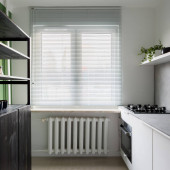Panorama prostej kuchni z dużym oknem, szarym blatem i vintage stylu, drewniana szafka