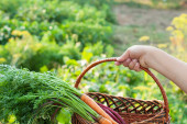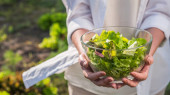 Kobieta trzyma kosz świeżych liści sałaty wyrwanych z łóżka.