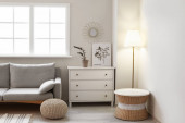 Dom pokój dzienny rogu z klasyczną szufladą i stylu szafy. tło ściany z cegły.