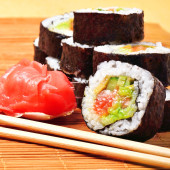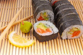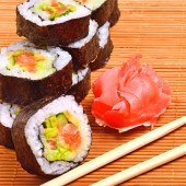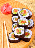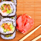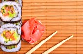 sushi, rolki, imbir i chopstick na mat bambusowych