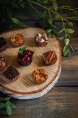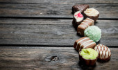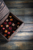 Domowej roboty czekoladowe słodycze z różnymi nadzieniami. Ciemne drewniane tło.