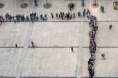 Ludzie spacerujący ulicą w Mediolanie, Włochy. ludzie spacerujący po chodniku widziani z lotu drona, w centrum Mediolanu