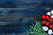 Smaczne soczyste dojrzałe warzywa z przyprawami na drewnianym tle, tło warzywne, koncepcja zdrowego odżywiania