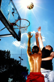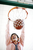 Widok z dołu człowieka próbującego strzelić piłkę do obręczy