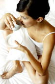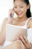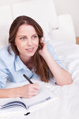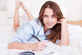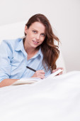 Widok z góry na kobietę patrzącą w kamerę leżącą na łóżku z długopisem i telefonem