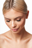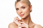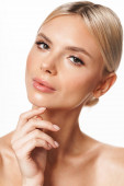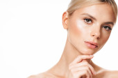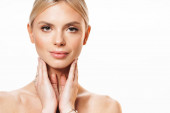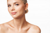 Obraz blondynki bez koszulki pozowanie i patrząc na aparat odizolowany na białym tle