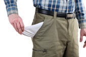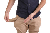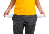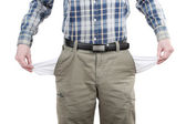 człowiek pokazano jego puste kieszenie na białym tle