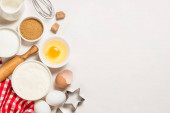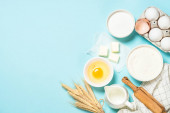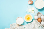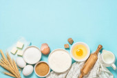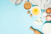Składniki do pieczenia na niebieskim stole widok z góry.