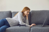 Zdjęcie "Biznes internetowy. Uśmiechnięta młoda dziewczyna w okularach pracująca nad projektem przez sieć z domu. Student oglądania webinar" może być wykorzystywane do celów osobistych i komercyjnych zgodnie z warunkami zakupionej licencji Royalty-free. Obraz jest dostępny do pobrania w jakości wysokiej rozdzielczości do 5760x3840.