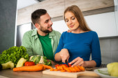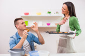 Szczęśliwa wielonarodowa para gotująca w kuchni. Robią ciasteczka..