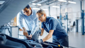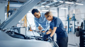 Zdjęcie "Piękne upoważnienie Kobieta mechanik samochodowy pracuje nad pojazdem w serwisie. Wygląda na szczęśliwą, gdy używa grzechotki. Specjalista nosi okulary ochronne." może być wykorzystywane do celów osobistych i komercyjnych zgodnie z warunkami zakupionej licencji Royalty-free. Obraz jest dostępny do pobrania w jakości wysokiej rozdzielczości do 5760x3840.
