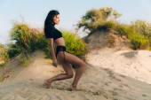 Widok z boku młodej kobiety w ozdobnym stroju kąpielowym siedzącej na piaszczystym wzgórzu w słoneczny dzień na plaży