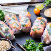 Zdjęcie "Wiosenne lub letnie bułki z papierem ryżowym, marchewką, sosem chili, czerwoną kapustą, cukinią, pieprzem, krewetkami i kumkwatami. Smaczne azjatyckie jedzenie." może być wykorzystywane do celów osobistych i komercyjnych zgodnie z warunkami zakupionej licencji Royalty-free. Obraz jest dostępny do pobrania w jakości wysokiej rozdzielczości do 5760x3840.