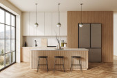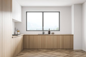 Zdjęcie "Narożnik nowoczesnej kuchni z białymi ścianami, drewniana podłoga, drewniane blaty z wbudowaną kuchenką i umywalką i szafką. Okno z zamazanym widokiem na góry. 3d renderowanie" może być wykorzystywane do celów osobistych i komercyjnych zgodnie z warunkami zakupionej licencji Royalty-free. Obraz jest dostępny do pobrania w jakości wysokiej rozdzielczości do 5760x3840.