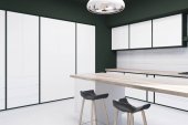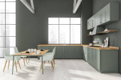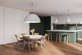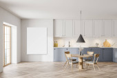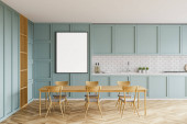 Narożnik przestronnej kuchni z biało-ceglanymi ścianami, drewnianą podłogą, niebieskimi blatami i szafkami oraz drewnianym stołem jadalnym. Zamazany tropikalny widok. 3d renderowanie