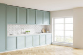 Zdjęcie "Narożnik przestronnej kuchni z biało-ceglanymi ścianami, drewnianą podłogą, niebieskimi blatami i szafkami oraz drewnianym stołem jadalnym. Zamazany tropikalny widok. 3d renderowanie" może być wykorzystywane do celów osobistych i komercyjnych zgodnie z warunkami zakupionej licencji Royalty-free. Obraz jest dostępny do pobrania w jakości wysokiej rozdzielczości do 5760x3840.