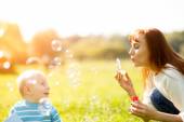 piękna mama i dziecko na zewnątrz. rodzina szczęśliwy grając w przyrodzie. mo
