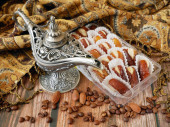 Wschodnie słodycze z orzechami, cukierki, metalowy wazon, herbata, daty na drewnianym tle, zbliżenie