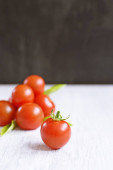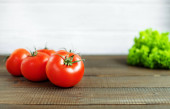 Świeże soczyste gałązki pomidora na drewnianym talerzu.