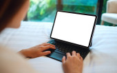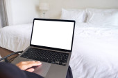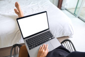 Zdjęcie "Makieta kobiety leżącej na łóżku, używającej i piszącej na laptopie z białą klawiaturą na pulpicie " może być wykorzystywane do celów osobistych i komercyjnych zgodnie z warunkami zakupionej licencji Royalty-free. Obraz jest dostępny do pobrania w jakości wysokiej rozdzielczości do 5760x3840.