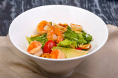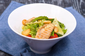 przekąska sałaty z pomidorami, kurczakiem, marynowanymi grzybami i majonezem