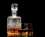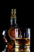 Imponująca i piękna butelka whisky na czarnym tle. Układ z wolną przestrzenią tekstową i pustą szklanką.