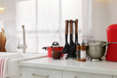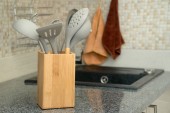 Uchwyt z łyżkami i ręcznikiem na marmurowym stole w kuchni. Miejsce na tekst