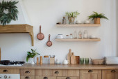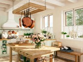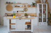 Zdjęcie "Jasne drewniane wnętrze kuchni ze stołem na środku jadalni. Piękne wnętrza kuchni" może być wykorzystywane do celów osobistych i komercyjnych zgodnie z warunkami zakupionej licencji Royalty-free. Obraz jest dostępny do pobrania w jakości wysokiej rozdzielczości do 5760x3840.