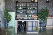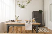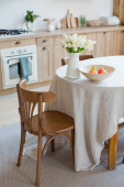 Jasne drewniane wnętrze kuchni ze stołem na środku jadalni. Piękne wnętrza kuchni