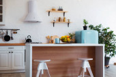 Jasne drewniane wnętrze kuchni. Piękne wnętrza kuchni. Zamazane meble kuchenne i pusty stół