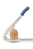 Kiełbaski spadają na patelnię grillową na białym tle, widok poziomy