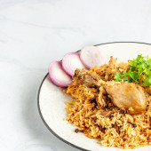 Jeden ryż z kurczaka pot na białym talerzu z cytryną i świeże zioło na białym tle zdjęcie poziome