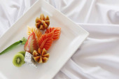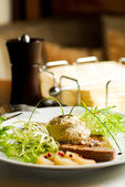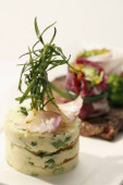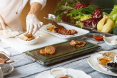Skup się na pysznym posiłku z mężczyzną siedzącym w tle.