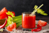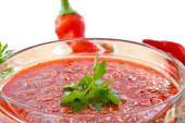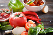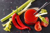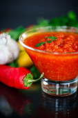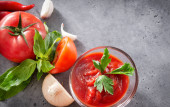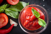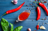 ketchup z gałązką zielonej pietruszki, zioła, plasterki pomidorów, czerwony pieprz chili, czosnek, kostki lodu, na czarnym tle, widok z góry sosu,