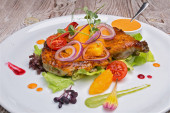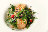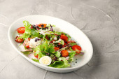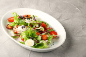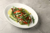 grillowana wołowina z ziemniakami i sałatką zbliżenie na białym talerzu i betonu z powrotem
