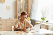 Zdjęcie "Mężczyzna korzystający z telefonu komórkowego w domu" może być wykorzystywane do celów osobistych i komercyjnych zgodnie z warunkami zakupionej licencji Royalty-free. Obraz jest dostępny do pobrania w jakości wysokiej rozdzielczości do 5760x3840.