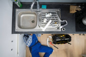 Zdjęcie "Widok z góry hydraulik w odzieży roboczej mocowanie zlewozmywak w pobliżu narzędzi na podłodze " może być wykorzystywane do celów osobistych i komercyjnych zgodnie z warunkami zakupionej licencji Royalty-free. Obraz jest dostępny do pobrania w jakości wysokiej rozdzielczości do 5760x3840.